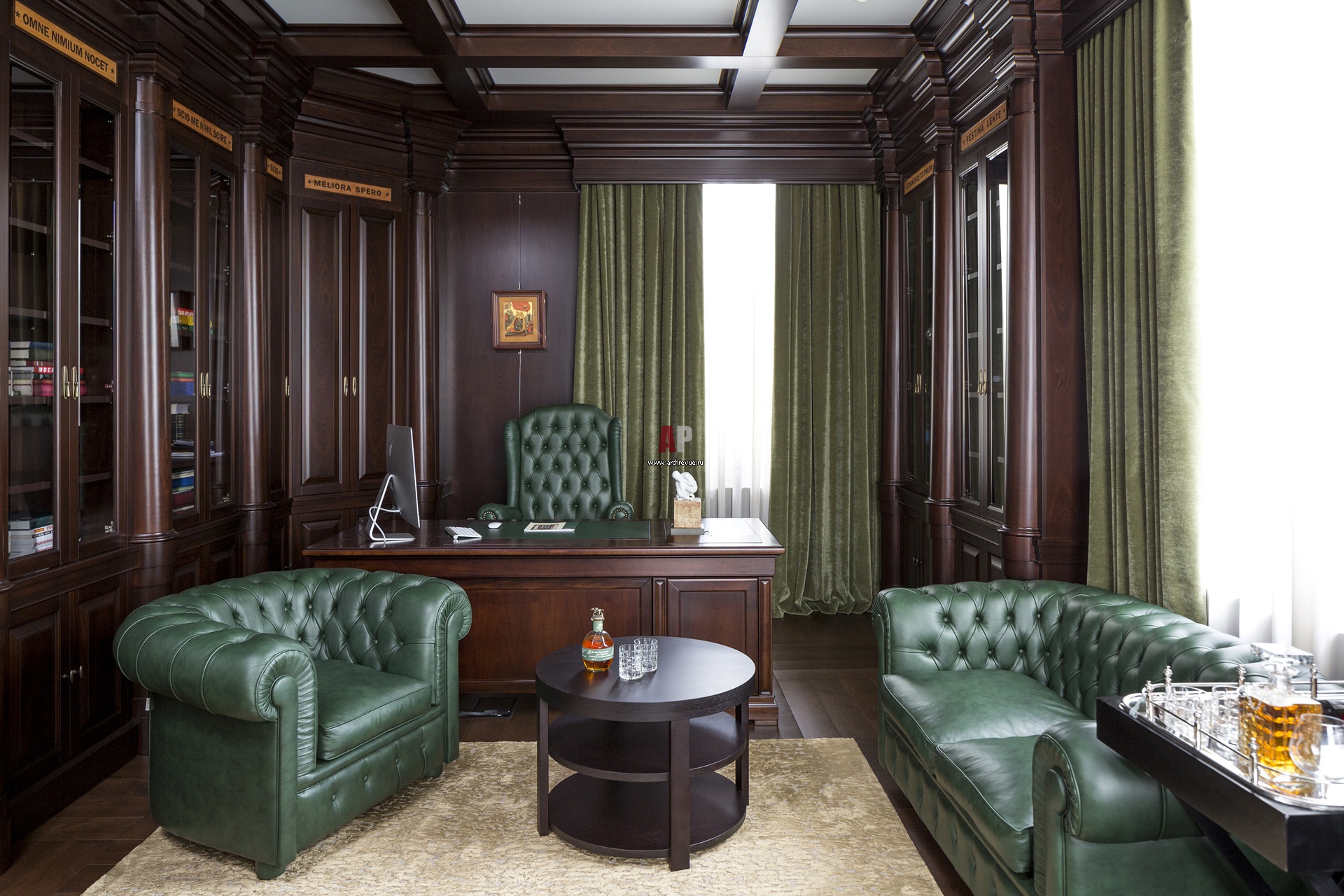 Интерьер классического английского кабинета выглядит декоративно за счет авторским стеллажей из резного дерева, потолочных балок и кресел из темно-зеленой кожи. Стеллажи, рабочий проект, изготовление, «АФ Ника».