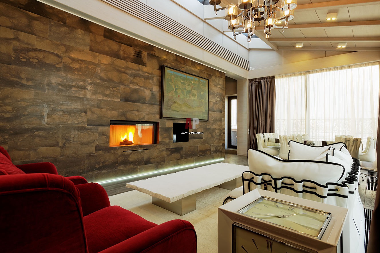 Интерьер зоны отдыха с камином. Стена, за которой скрыт дымоход камина, облицована плитами мрамора. Низ каменной стены подсвечен светодиодами.