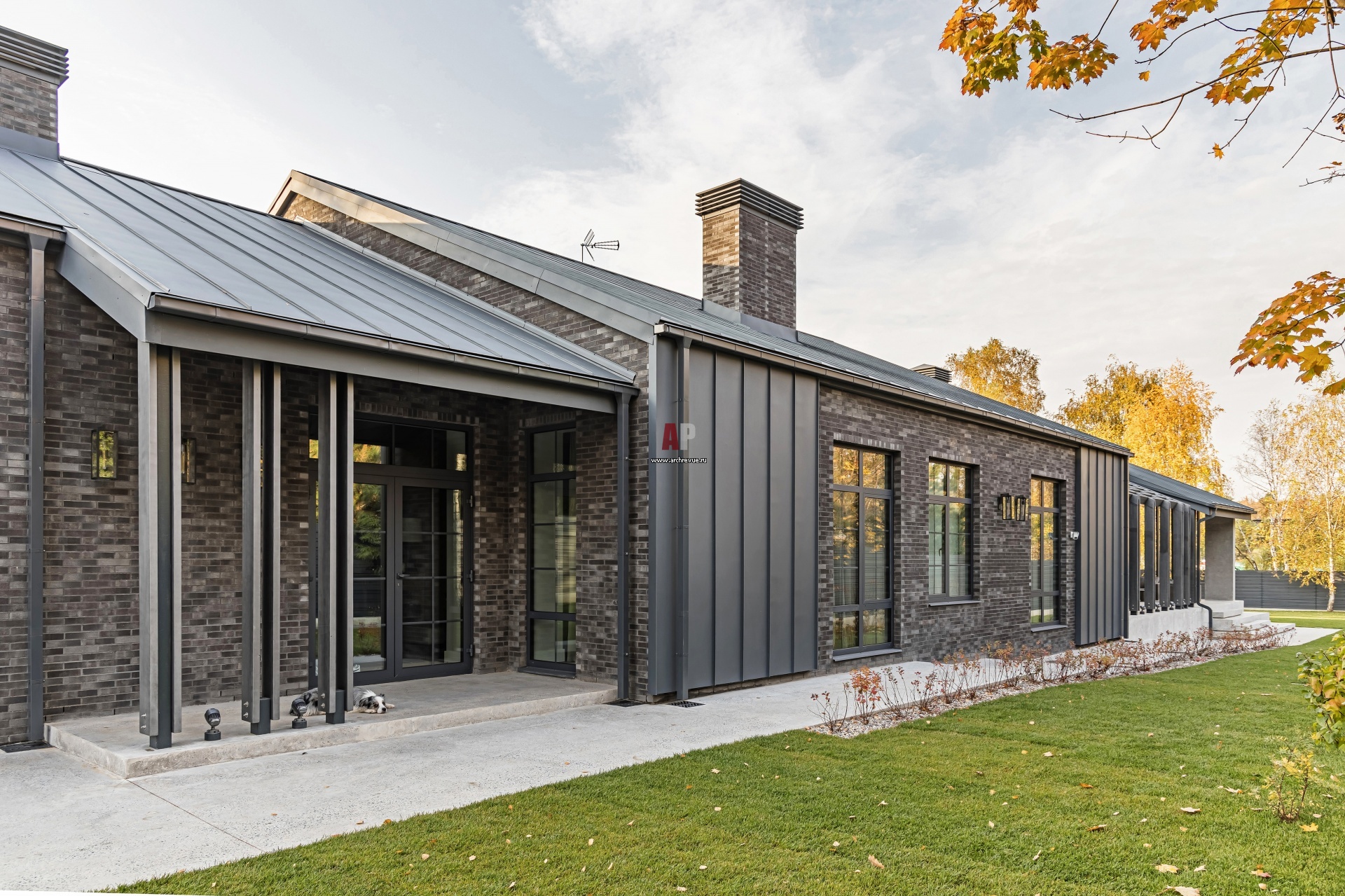 Дом из серого кирпича в фламандском стиле. Кровля и декоративные элементы фасада выполнены из фальцевого металла, Ruukki. Алюминиевые окна и двери, Alutech.