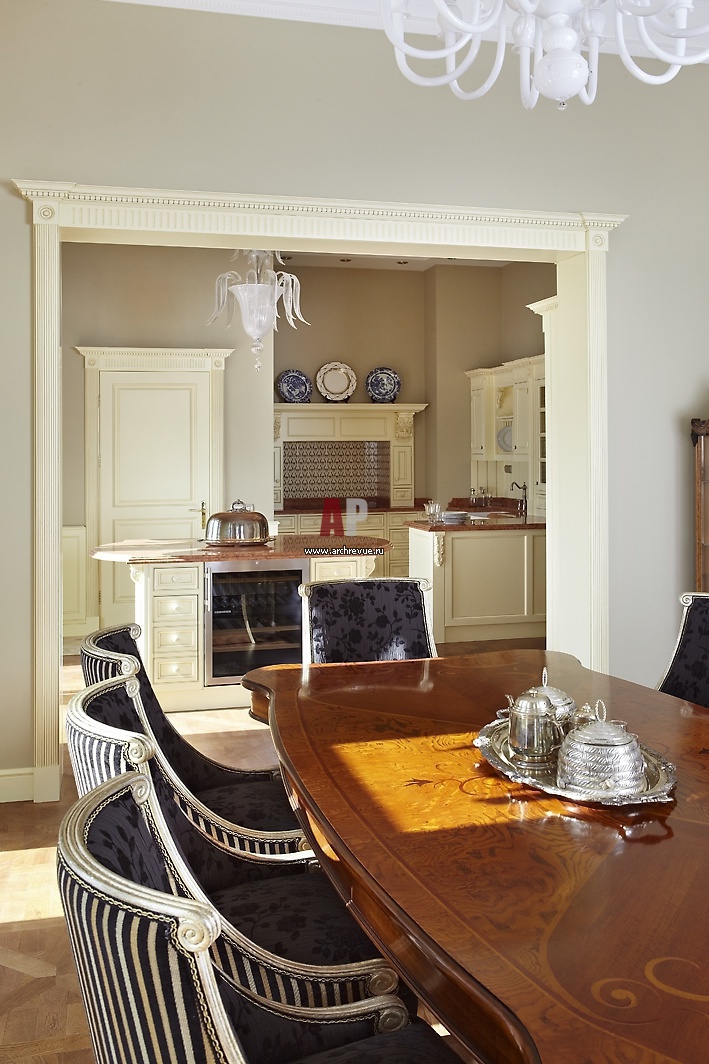 Кухню и столовую визуально связывает широкий открытый дверной проем, декорированный деревянным порталом с резьбой.