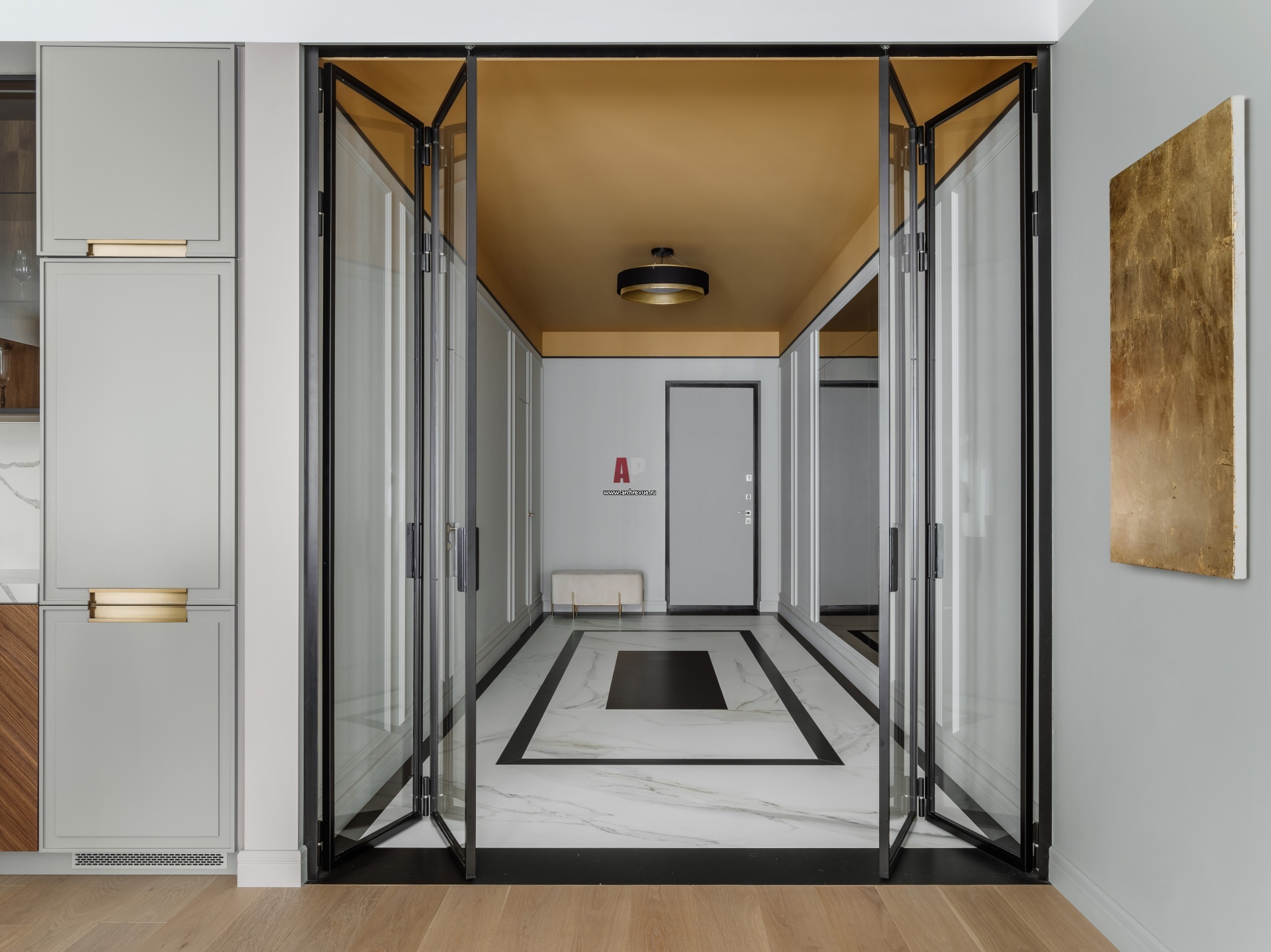 Потолок в прихожей выкрашен в активный карамельный цвет. Краска, Little Greene. Перегородка из черного металла и стекла выполнена на заказ. Геометрический рисунок на полу выполнен из керамогранита двух оттенков, ITT Ceramic. Картина работы Константина Федорова.
