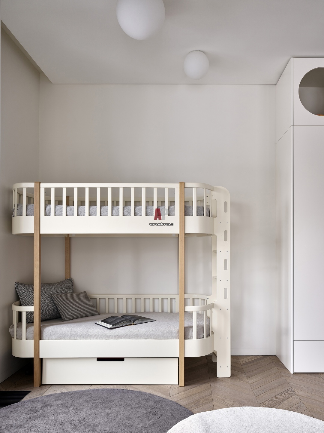 Зона сна в детской оформлена в спокойные светлые цвета.
