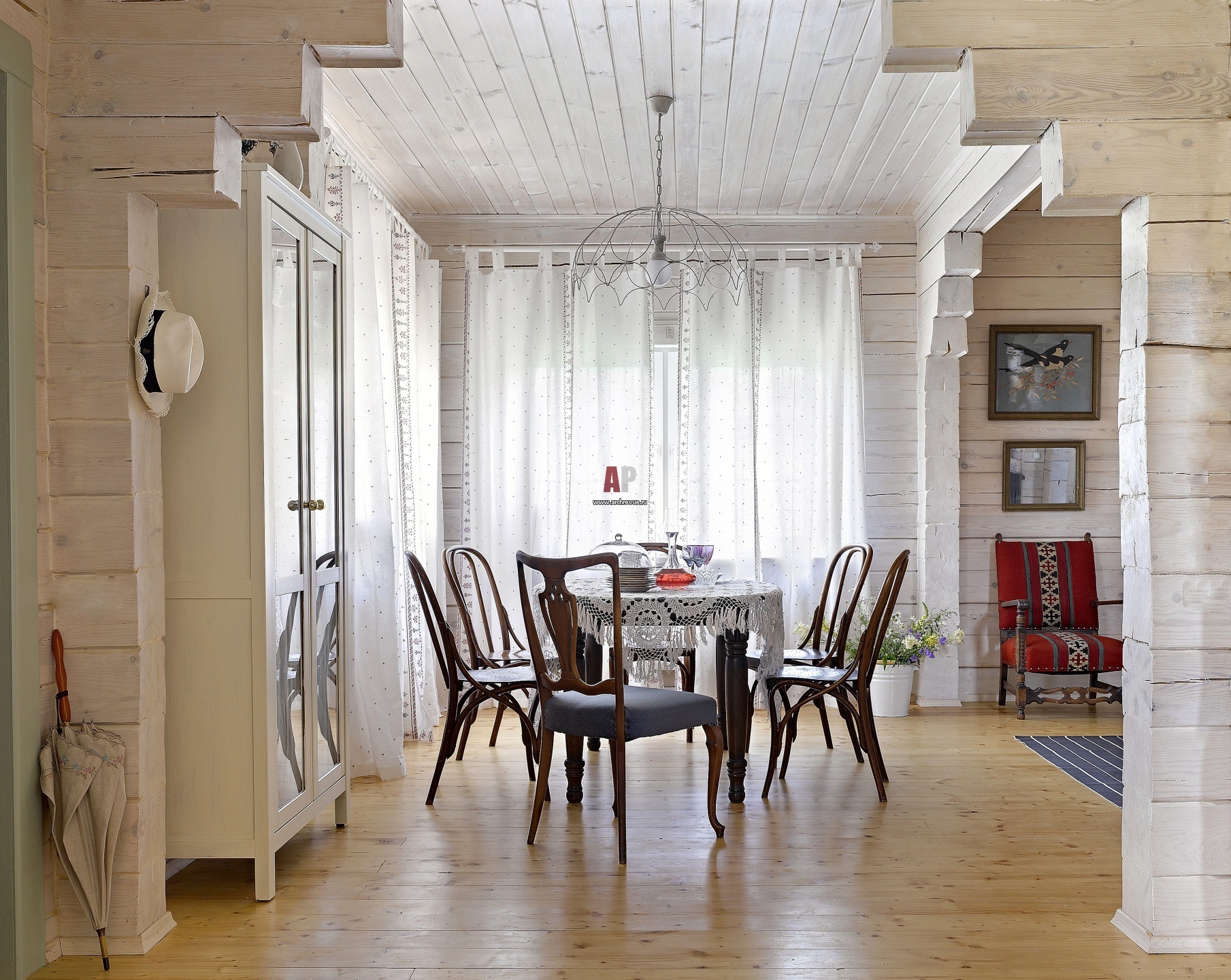 Вид со стороны кухни на столовую. Шторы сшиты из ткани «Трехгорная мануфактура». Круглый обеленный стол застелен кружевной скатертью из коллекции хозяйки дома.