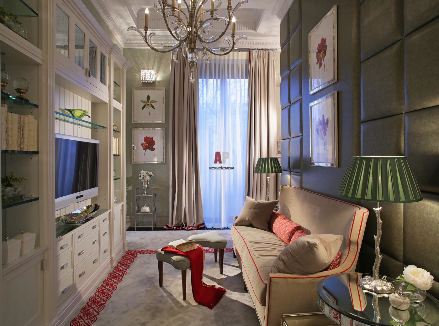 Фото интерьера зоны отдыха-будуара при спальне. С оливковыми стенами сочетаются бежевые шторы и ковры с тонким красным кантом.