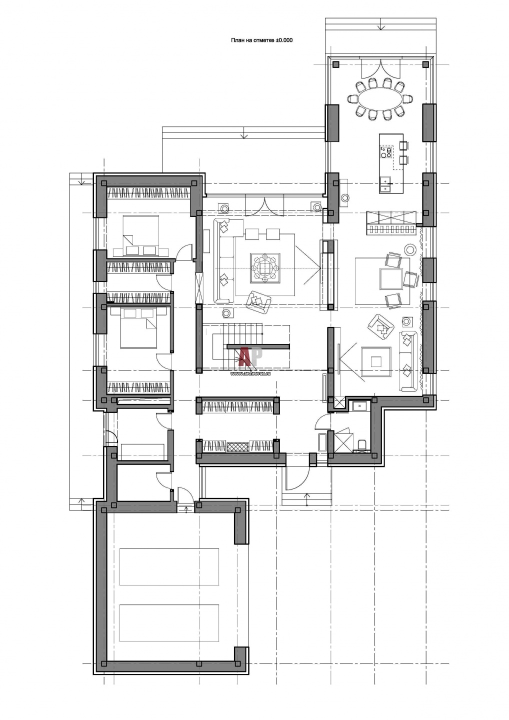 План первого этажа двухэтажного дома в современном стиле. Общая площадь– 500 кв. м.
