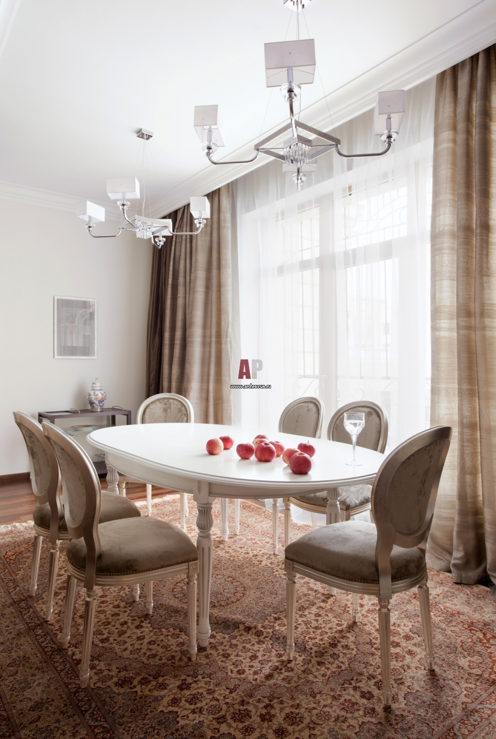 Столовая группа размещена возле панорамного окна. Овальный стол в стиле неоклассика с эмалевым финишем цвета топленого молока сочетается с современными светильниками из полированного металла. Восточный ковер ручной работы.