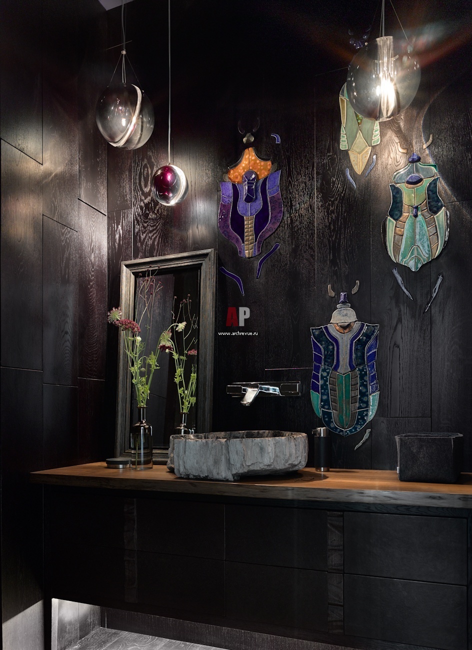 Акцент гостевого санузла – гигантские жуки-скарабеи. Они сделаны вручную из цветной керамики и размещены на стеновых панелях из темного дуба.