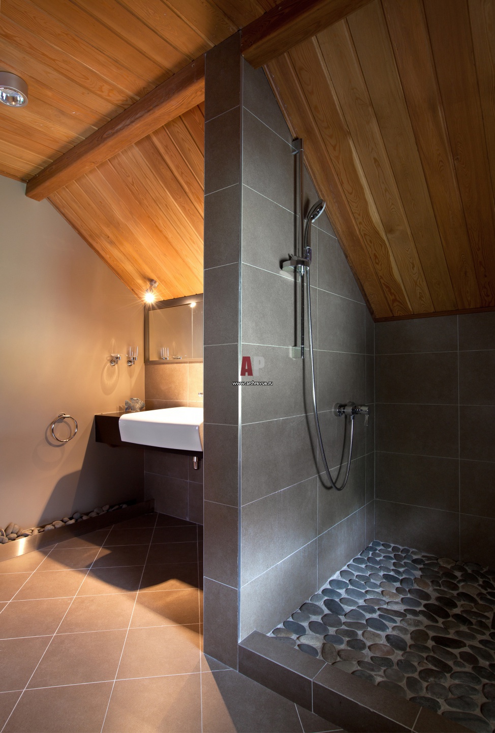 Гостевой санузел в мансарде. Пол выложен галькой, стены зашиты влагостойкой лиственницей.