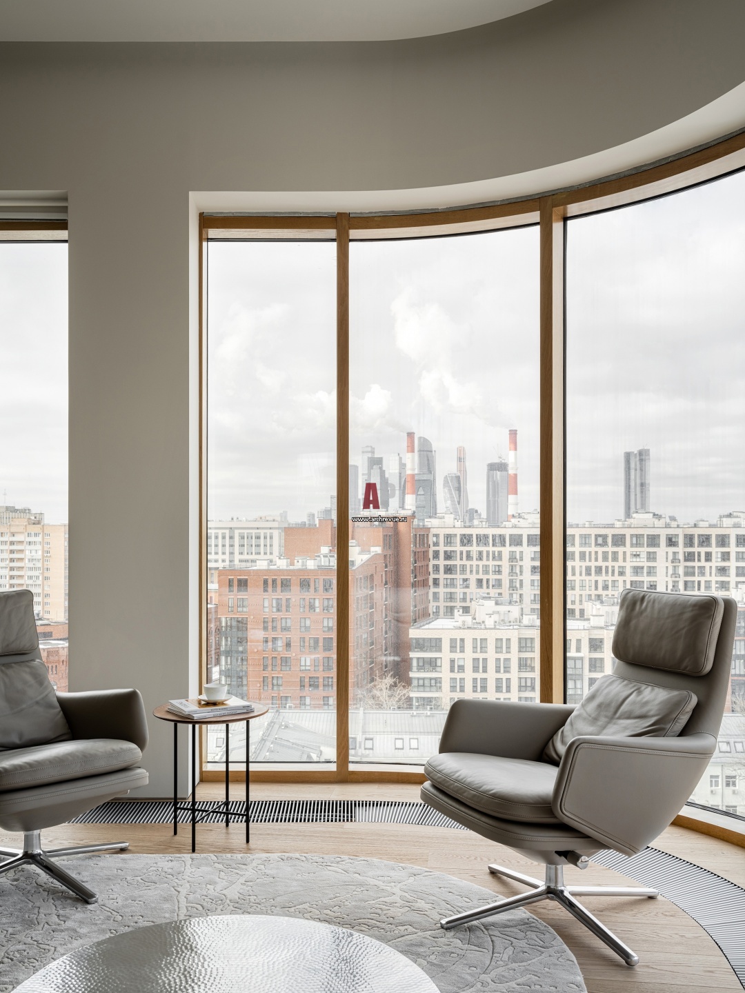 Видовая квартира с современным искусством. Зона отдыха в гостиной. Кресла, Vitra.