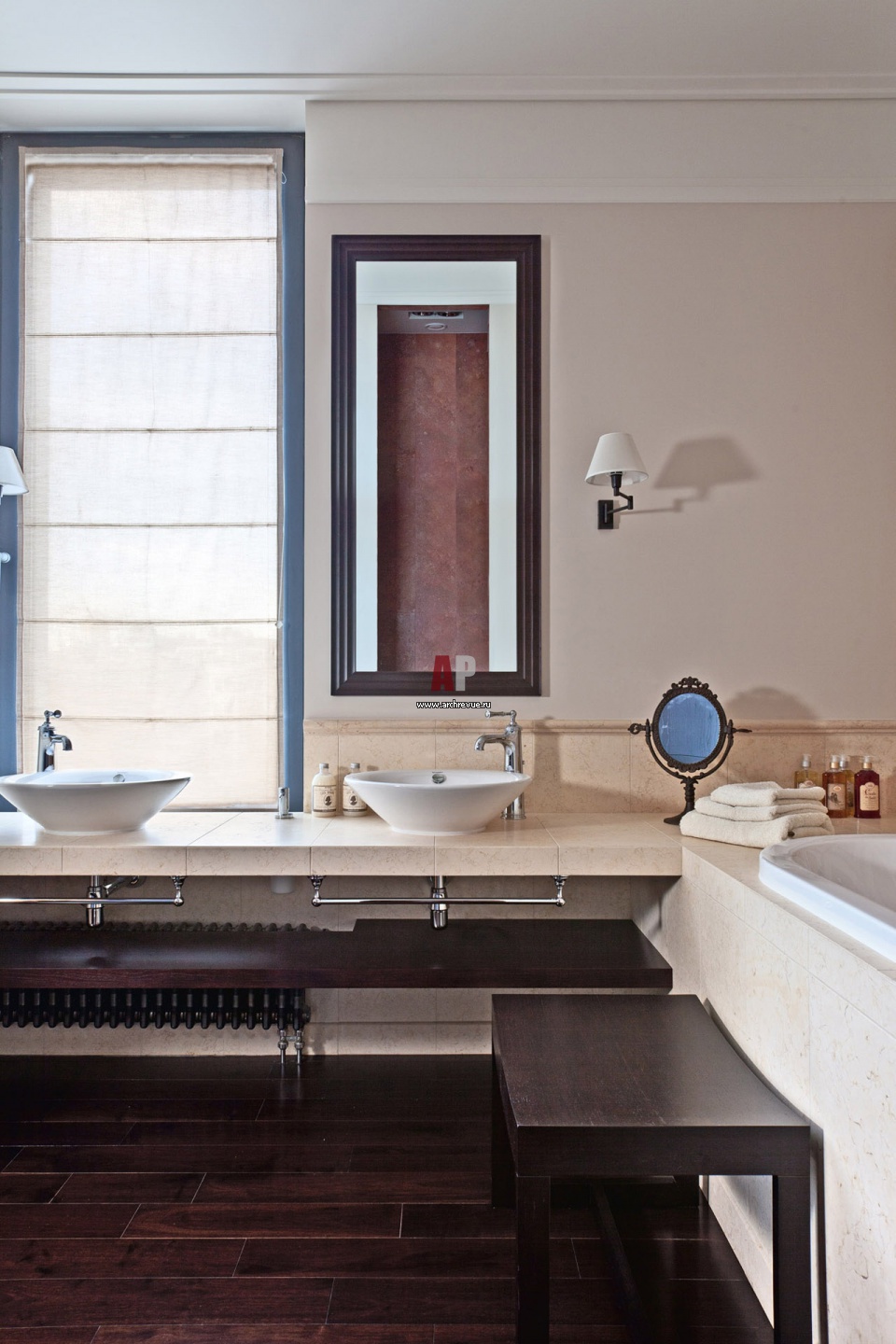 Умывальники в хозяйском санузле расположены возле окна. Столешница выполнена из травертина. На полу - половая доска.