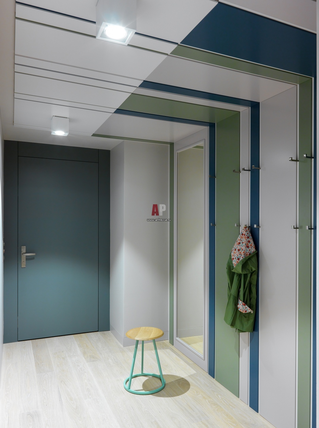Прихожая решена в скандинавском стиле. Строгая геометрия, использование белого, синего и зеленого цветов увеличивают пространство и дают ощущение природной свежести.