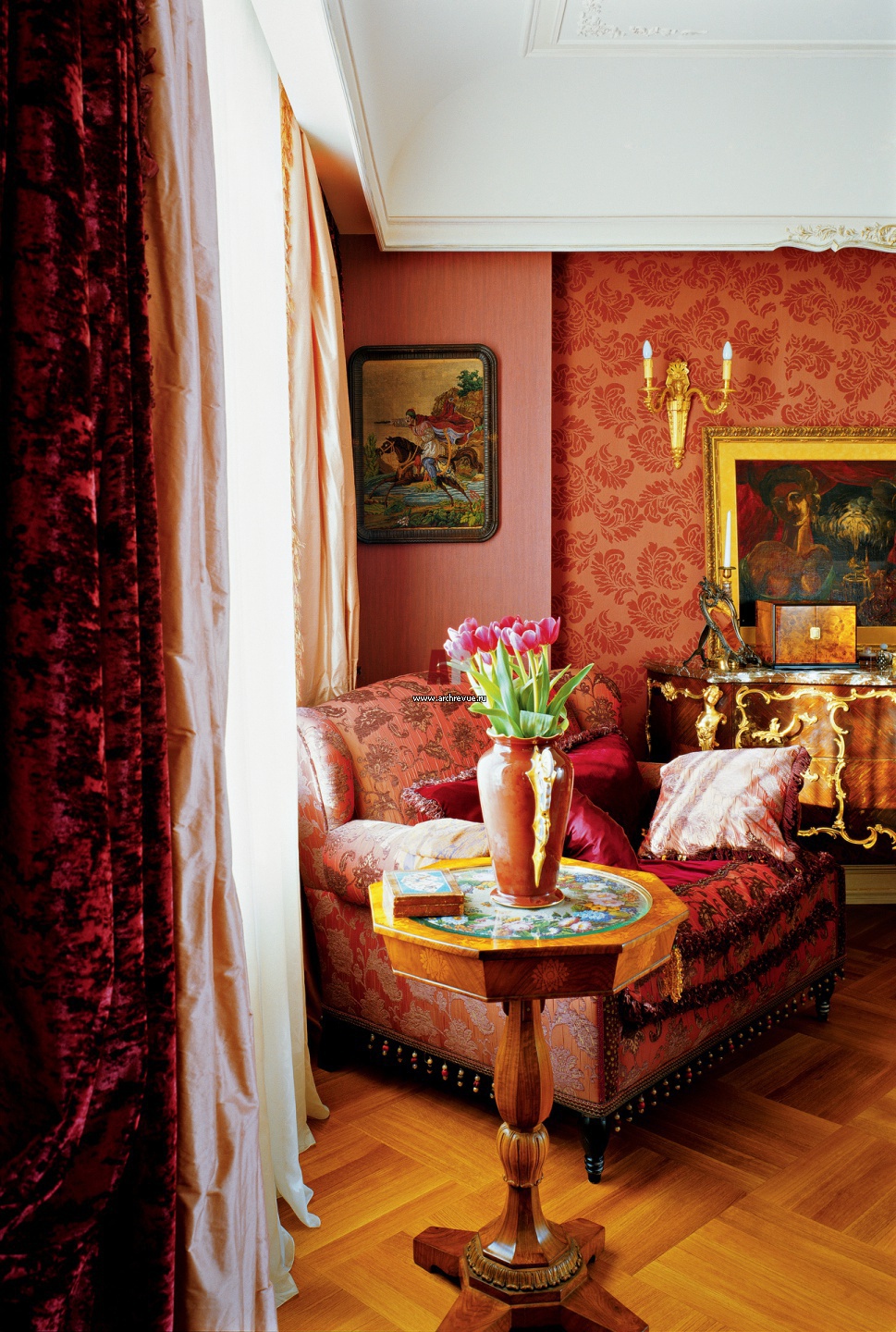 На фото – интерьер классической спальни в ярких красных тонах. Бархатные шторы выглядят парадно.