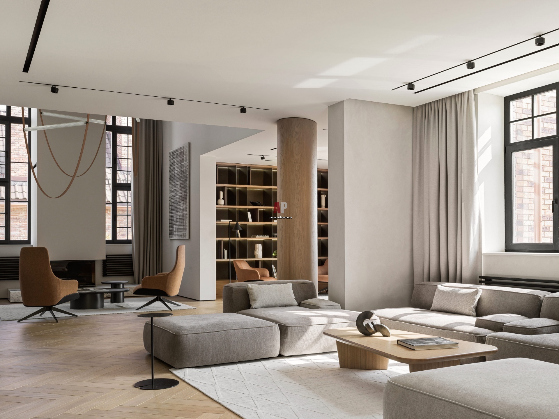 Общая гостиная с камином и библиотекой. Диваны, Lema. Придиванный журнальный столик и библиотека, на заказ, по эскизам дизайнеров. Кресла и столики у камина, Molteni &C. Светильники, Flos.