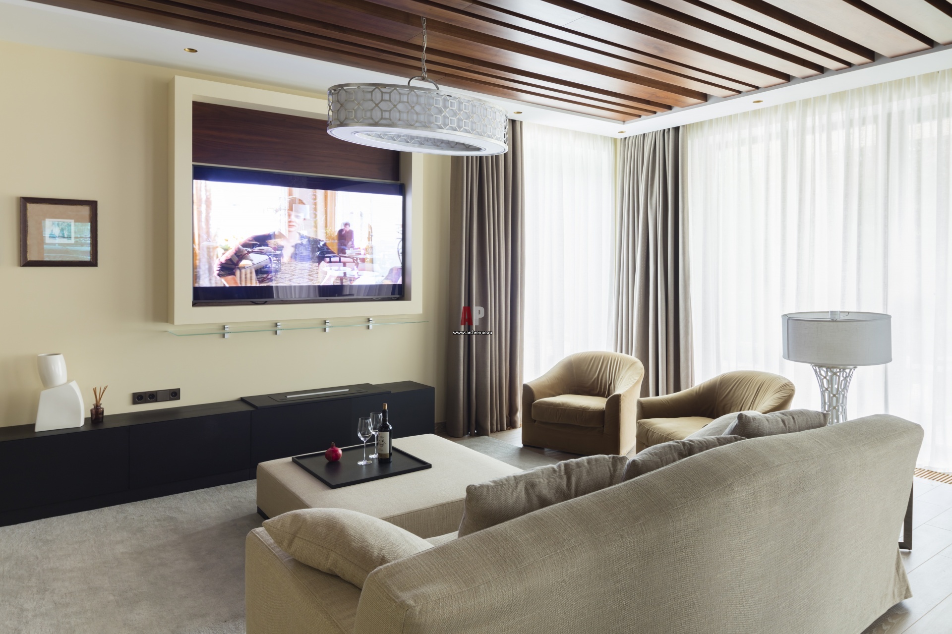 Мягкая группа в общей гостиной. Пол всего первого этажа выложен плиткой с фактурой деревянной доски.