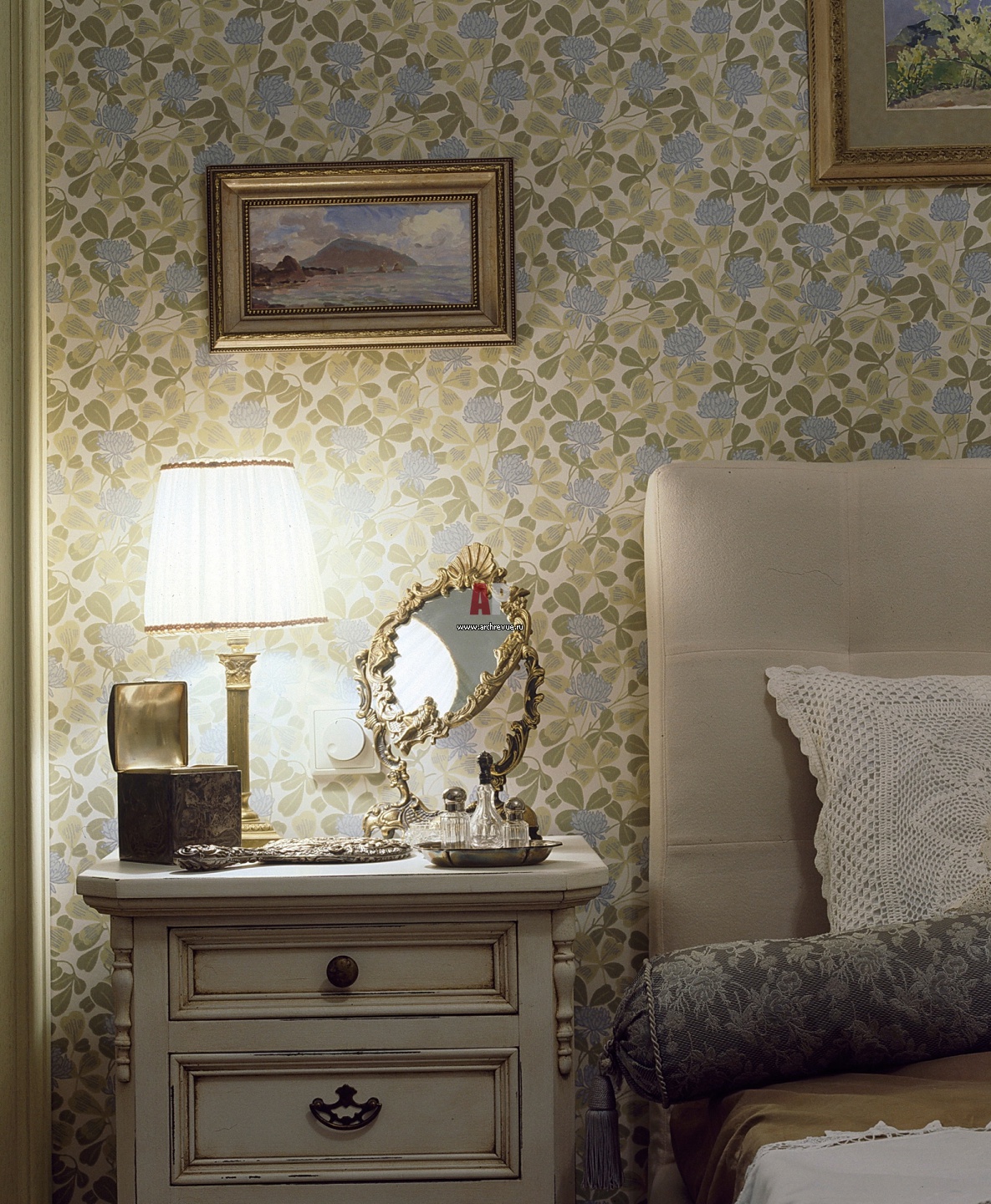 Интерьер спальни. Прикроватная тумбочка с патиной, Pantera Lucchese. Бумажные обои, Sanderson.