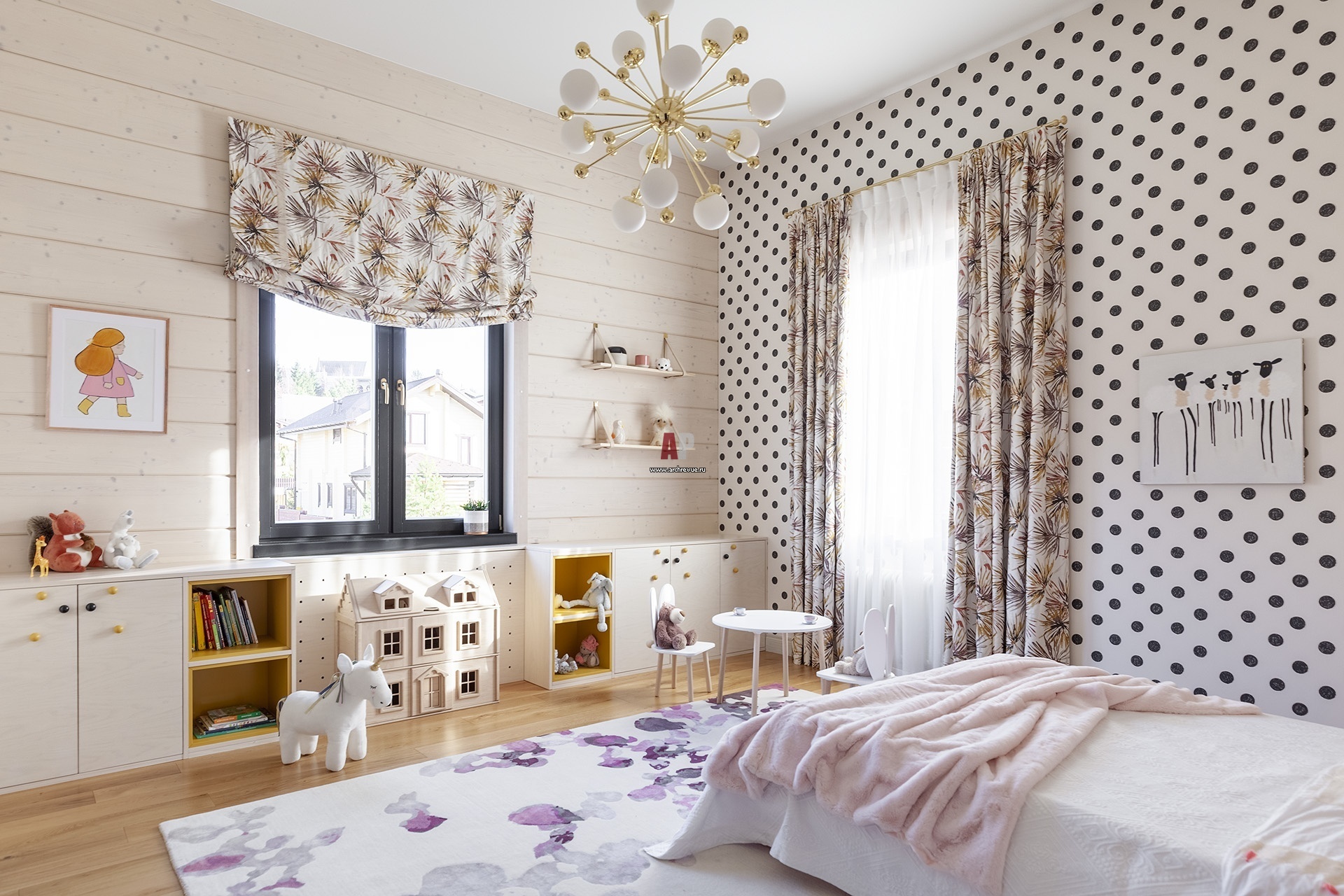 Комната дочери, которой исполнилось три года, сделана на вырост. На стенах – светлые обои с геометрическим рисунком «горох». Шкафы из ясеня с разноцветными ручками сделаны на заказ.