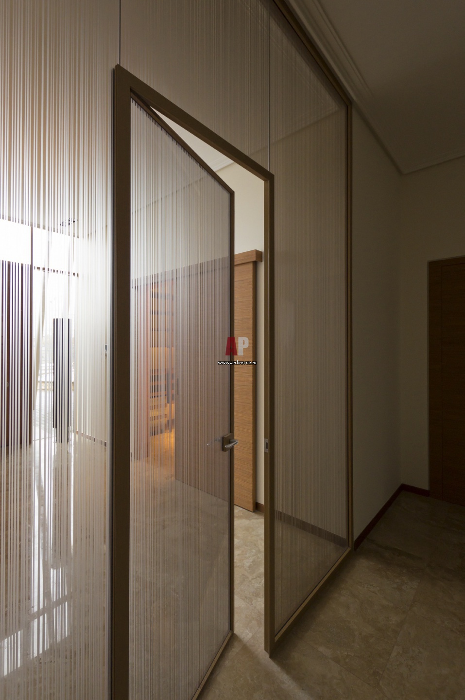 Перегородка из закаленного стекла (8 мм), в массе тонированного под бронзу. С каждой стороны на стекло нанесены матовые полосы со смещением рисунка при помощи пескоструйной обработки. Изготовление, StekloMet.