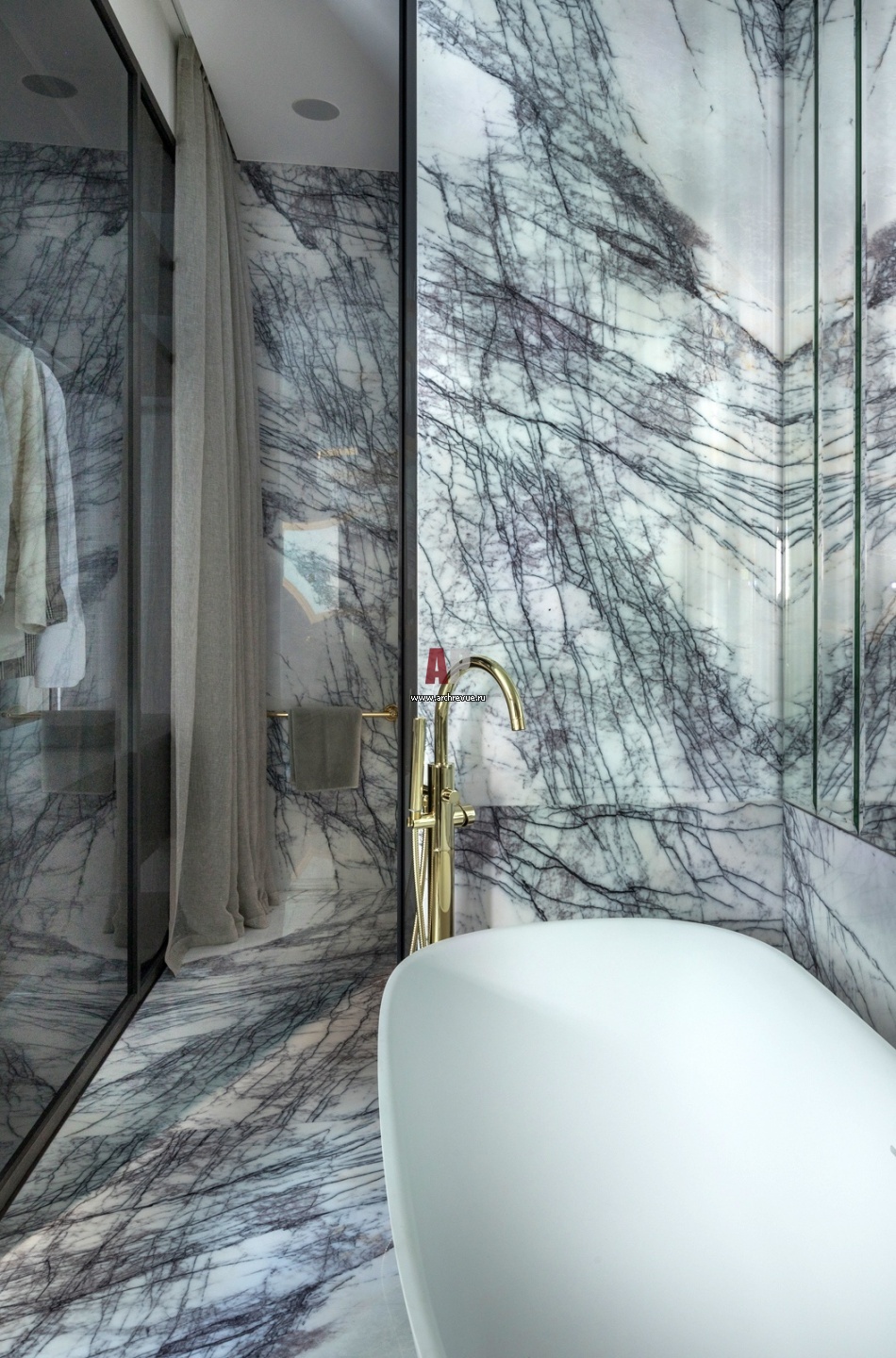 Роскошная квартира для приемов. Интерьер ванной в отделке мраморными панелями. Отдельно стоящая ванна, Falper. Напольный смеситель, Boca do Lobo.