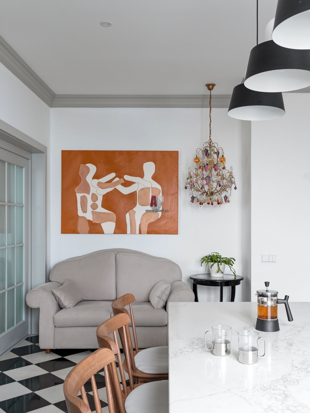 В нише на кухне размещен удобный диван. Над кофейным столиком – люстра с флористическим дизайном – компаньон люстры над столом.