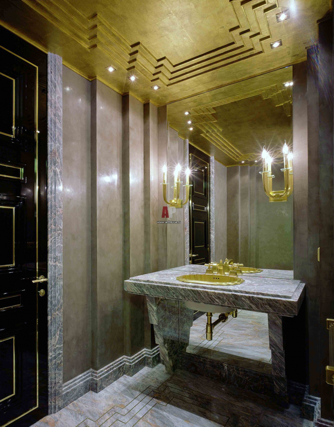 Интерьер золотой туалетной комнаты. Раковина сделана на заказ в Нью-Йорке. Потолок оклеен обоями ручной работы. Рисунку потолка вторят латунные вставки каменного пола.