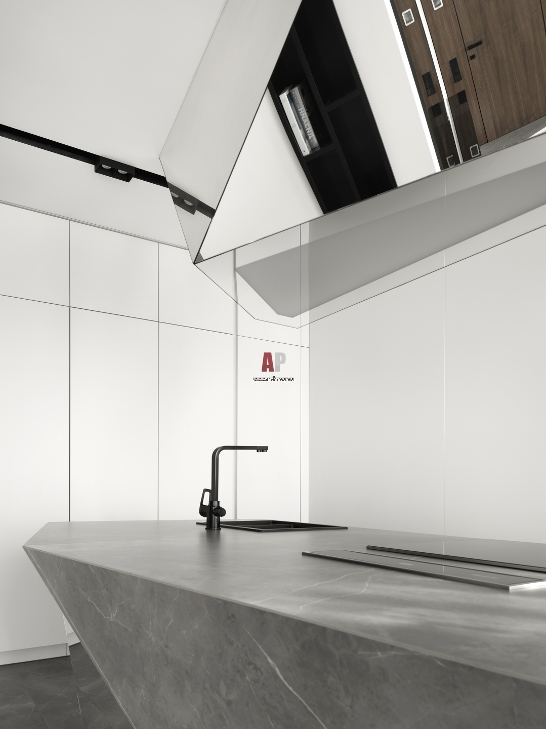 Ключевую роль играет остров из керамогранита и зеркал с ломаными гранями, деконструктивизм работает на контрасте с общим минималистским настроением проекта. Отражения в зеркалах меняются в зависимости от точки просмотра, создавая эффект игры объемов и преломлений света.