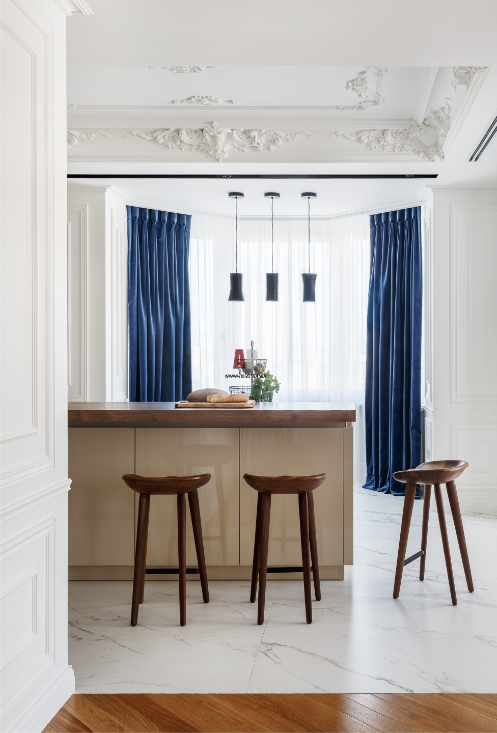 Квартира в стиле французской классики с цветными акцентами. Зона кухни. На полу – керамогранит, Casalgrande Padana, коллекция Marmorer