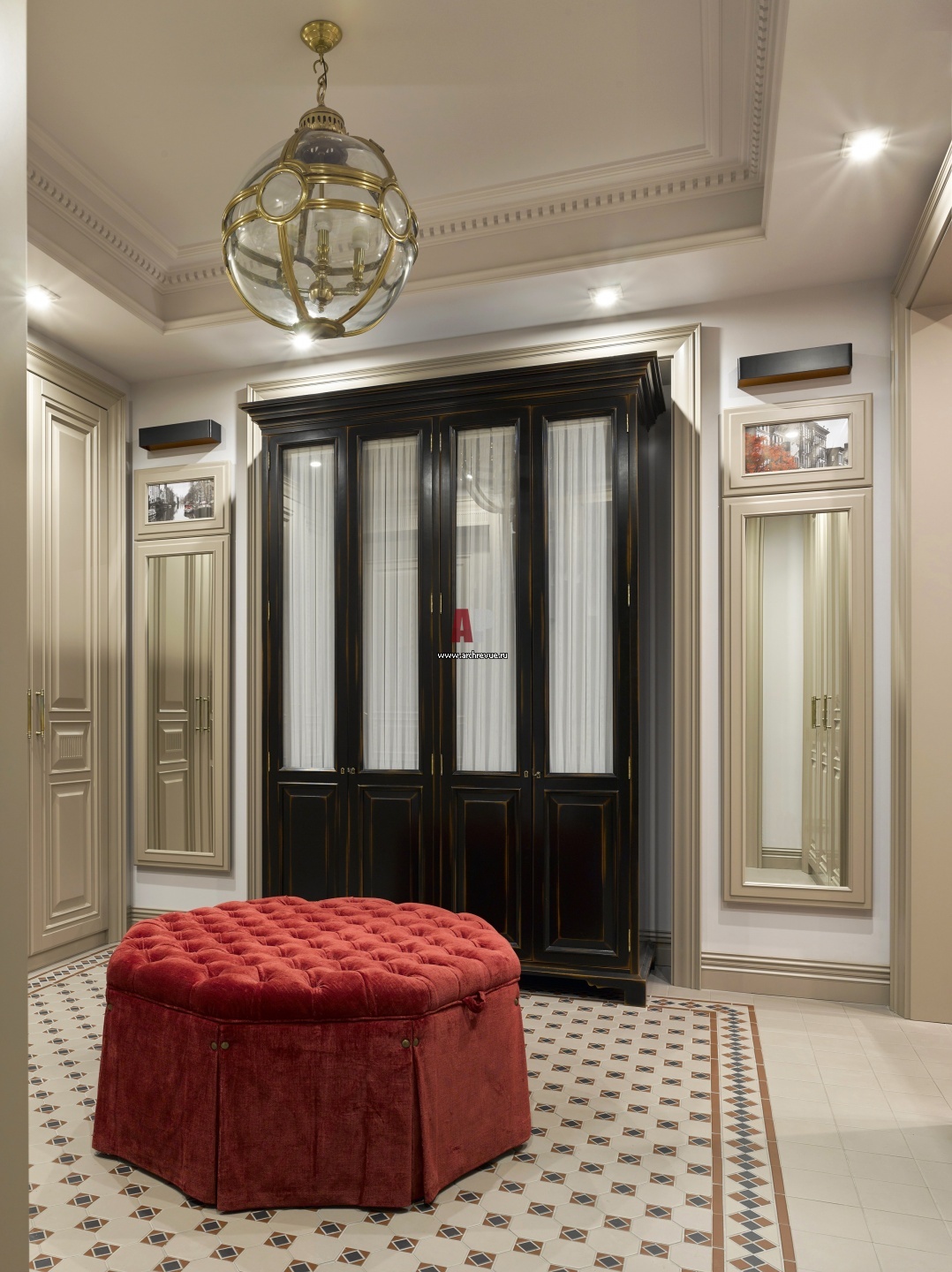 Большая квадратная прихожая напоминает парадный холл люксового исторического отеля. Расположенный по центру красный бархатный пуф – это еще и система хранения, он выполнен на заказ по эскизам дизайнера. Люстра, Eichholtz. Платяной шкаф из черного состаренного дерева с филенками, AM Classic. На полу – керамическая плитка, TopCer.