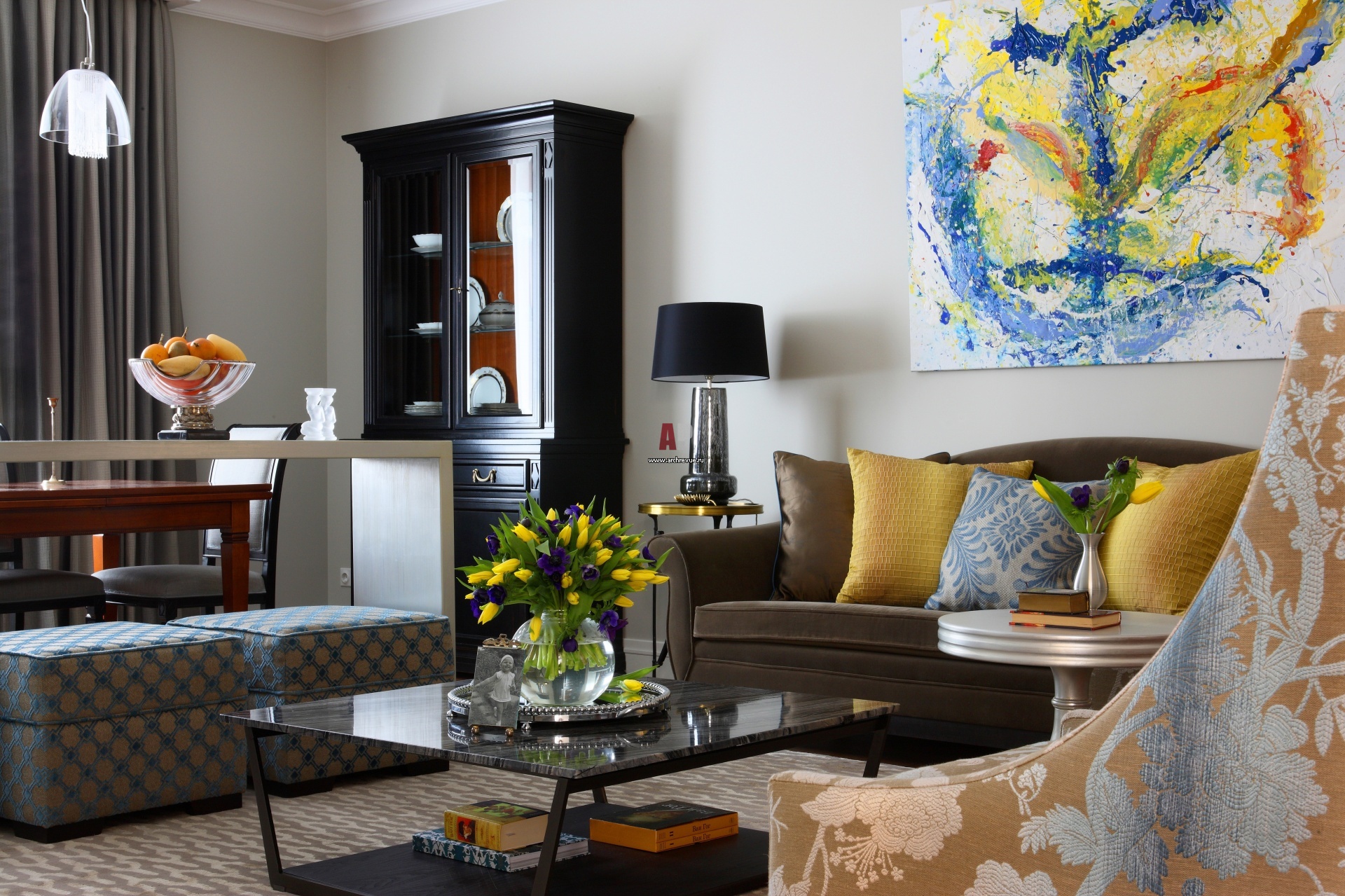 Парадная зона отдыха в гостиной. Диван и кресла, Marie's Corner. Журнальный столик, Flexform. Пуфы в обивке тканью Gaston y Daniela. Картина по мотивам художника Джозефа Альберса (Josef Albers) создана Ириной Бубновой в теплых цветах интерьера.