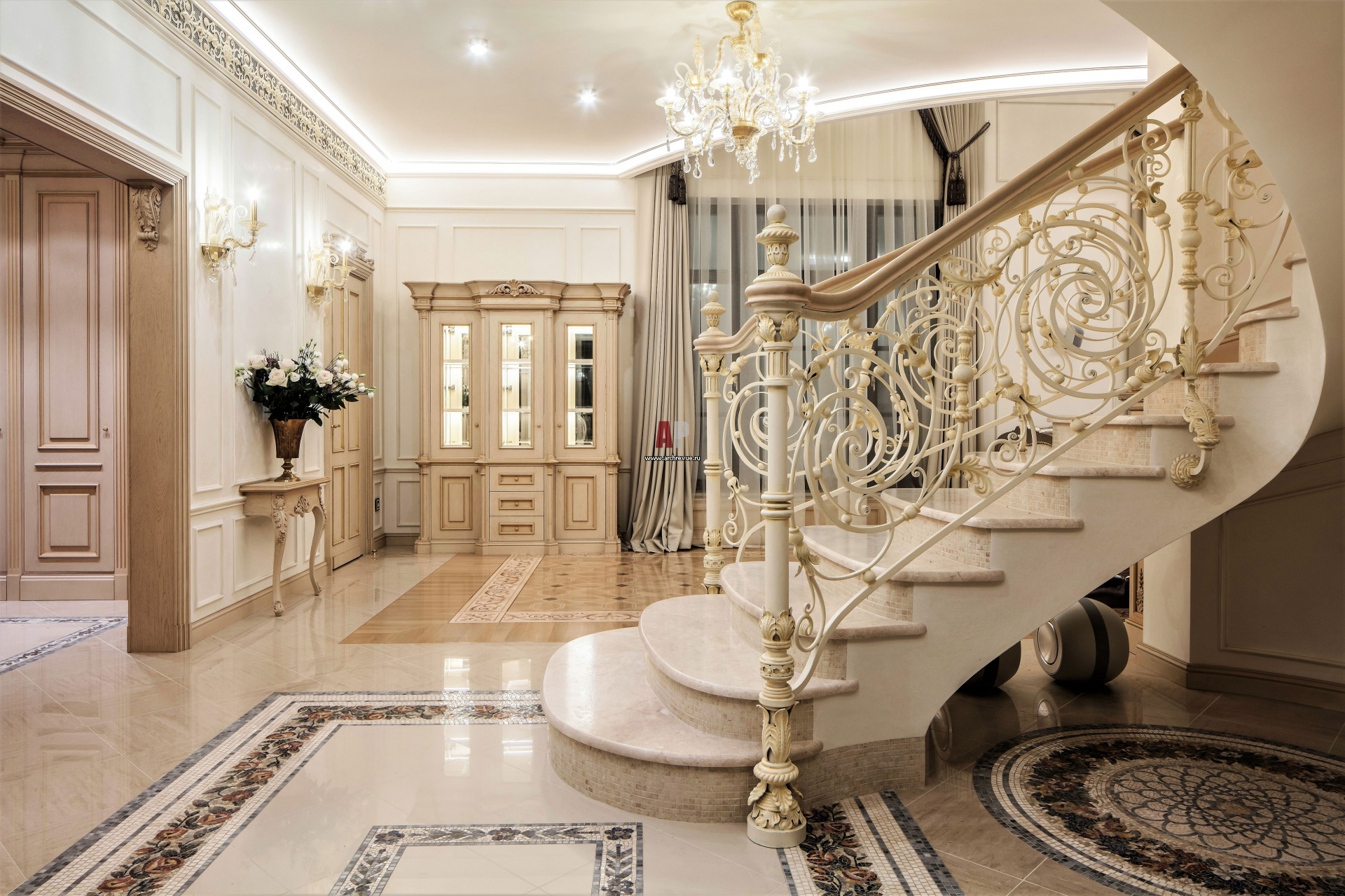 Лестничный холл обозначен напольными панно из каменной римской мозаики. Панно выполнены по эскизам авторов проекта. Комод, консоль, Modenese Gastone.
