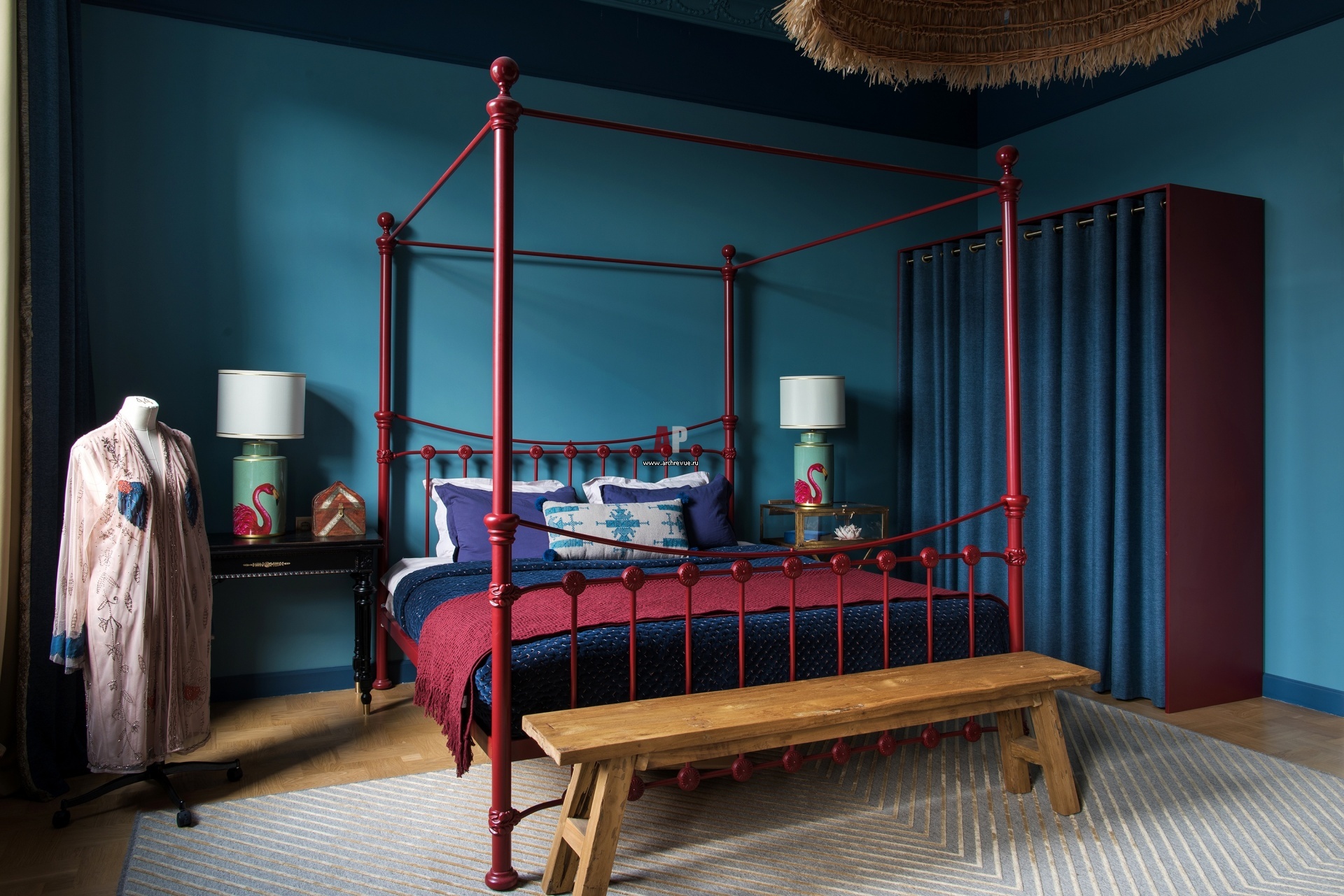 Хозяйская спальня оформлена в насыщенной гамме: стены окрашены в темный синий цвет, декоративные элементы выделены винно-бордовым. В интерьере присутствует восточная эклектика. Кованая кровать, шкафы, на заказ. Абажур потолочного светильника сделан из лозы.