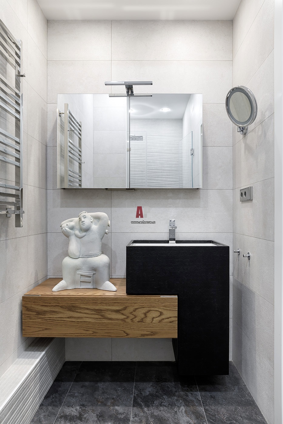 Санузел с душевой задуман как мужской. На самом деле им пользуются все члены семьи, поскольку активно занимаются спортом. На стенах – серая плитка с фактурой бетона, на полу – черная «под сланец», Venis Ceramica. Контрастная композиция из черной раковины и деревянной тумбы, Gamma Decor.
