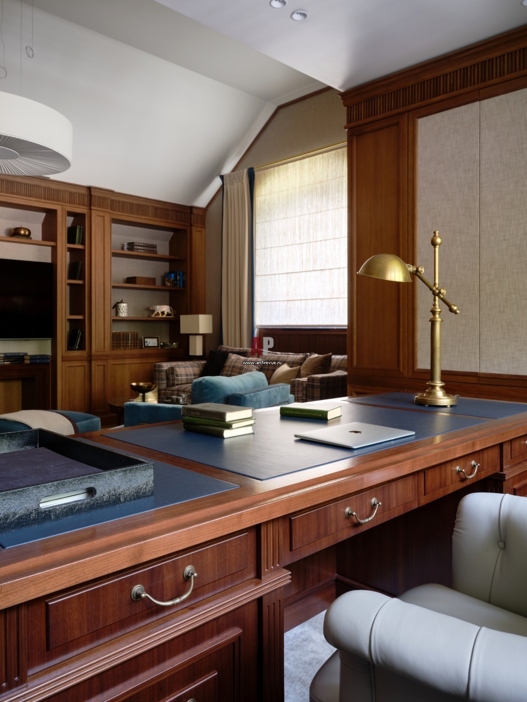 Дом в стиле американской классики для семьи с тремя детьми. Интерьер кабинета в мансарде. Диван и столик журнальный, Baker. Кресло и пуф, Vanguard Furniture.