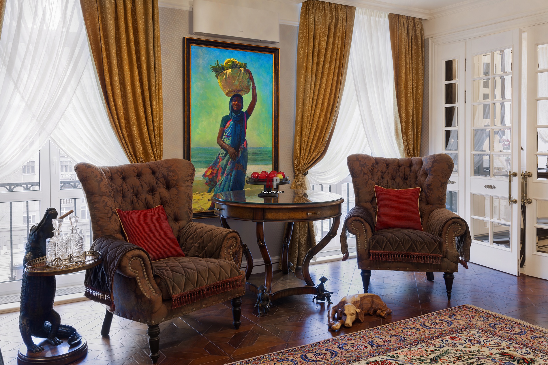 Между двумя французскими окнами в гостиной расположена зона отдыха с уютными классическими креслами. На полу – наборный паркет из красного дерева.