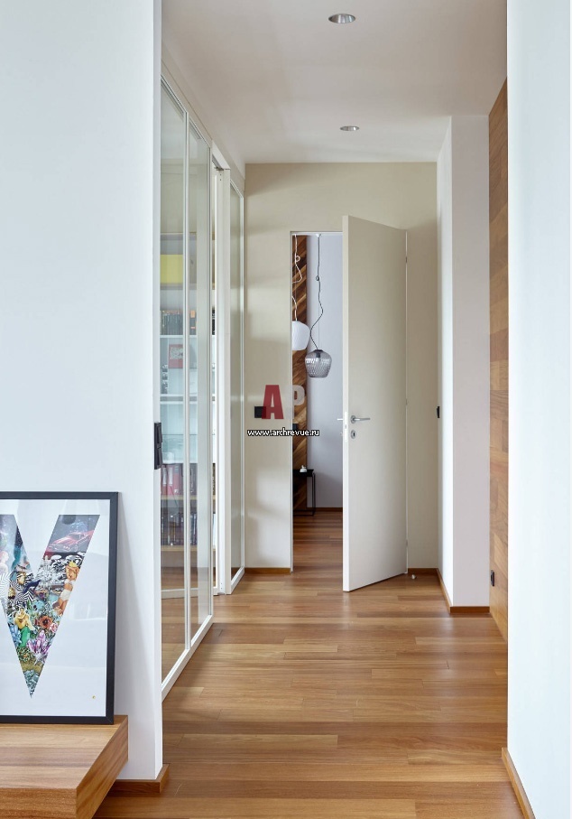 Квартира разделена на две части: общую гостиную и приватный блок. Спальню и кабинет в нем соединяет внутренний холл. На полу – инженерная доска кумару (бразильский тик).