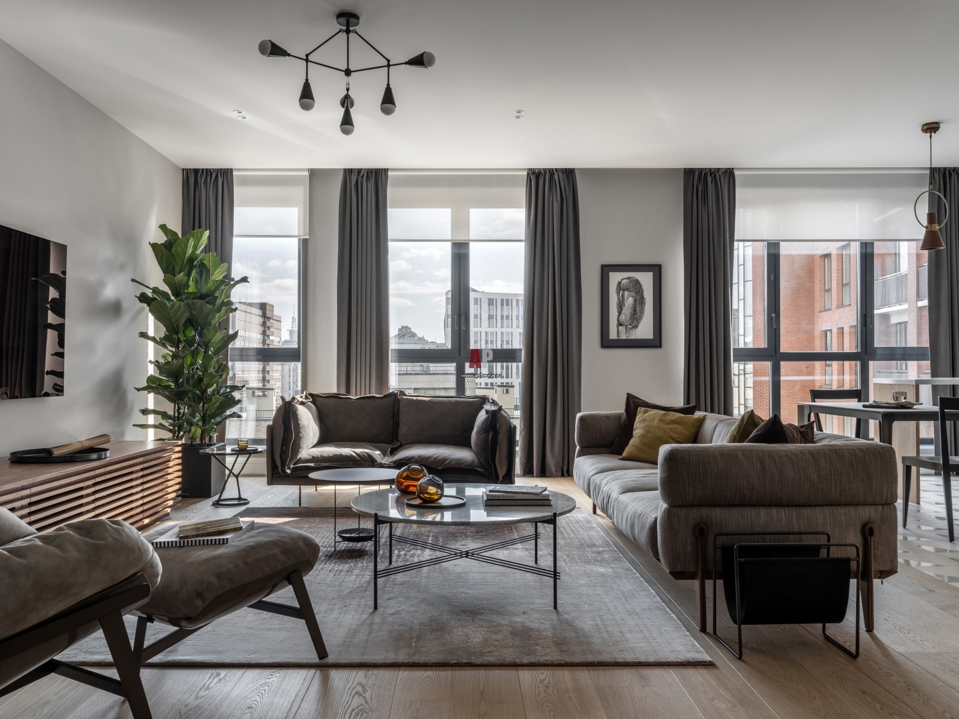 Гостиная выполнена в светлых серых тонах. Диваны, Giorgetti и Arketipo. Журнальные столики, Gubi и Poliform. Центральный потолочный светильник, Apparatus. Встроенные светильники, Delta Light.