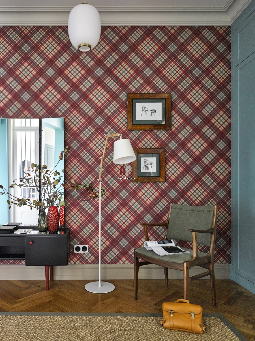 Интерьер прихожей в стиле ретро. Обои в красную клетку, Cole & Son. Трюмо, винтаж. Торшер, Aromas del Campo.