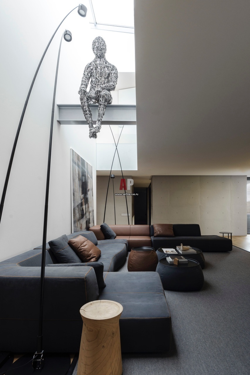 Смысловое ядро первого этажа – камерная гостиная со вторым светом над диванной группой, куда попадает естественный свет со стеклянной крыши. Арт-объект, Дмитрий Демидов.