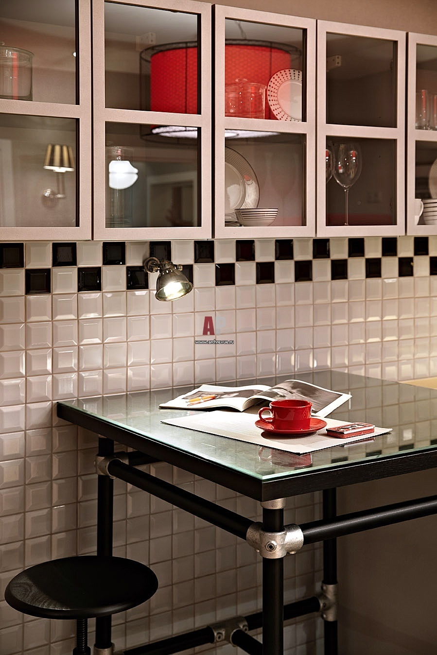 Кухонные настенные подвесные шкафчики с квадратными ячейками размещены на торцевой стороне. Под ними – маленький обеденный стол, Lambert.