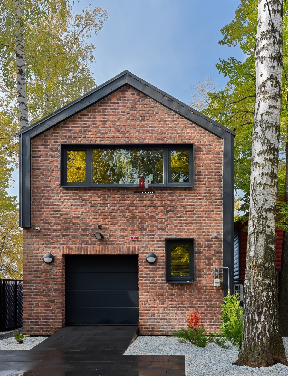 Двухэтажный дом построен по каркасной технологии на сваях. Снаружи облицован деревянными ламелями из лиственницы и плиткой под кирпич, созданной по слепкам старинных кирпичей. Часть фасадов и крыша из металла. Забор выполнен по эскизам архитектора.