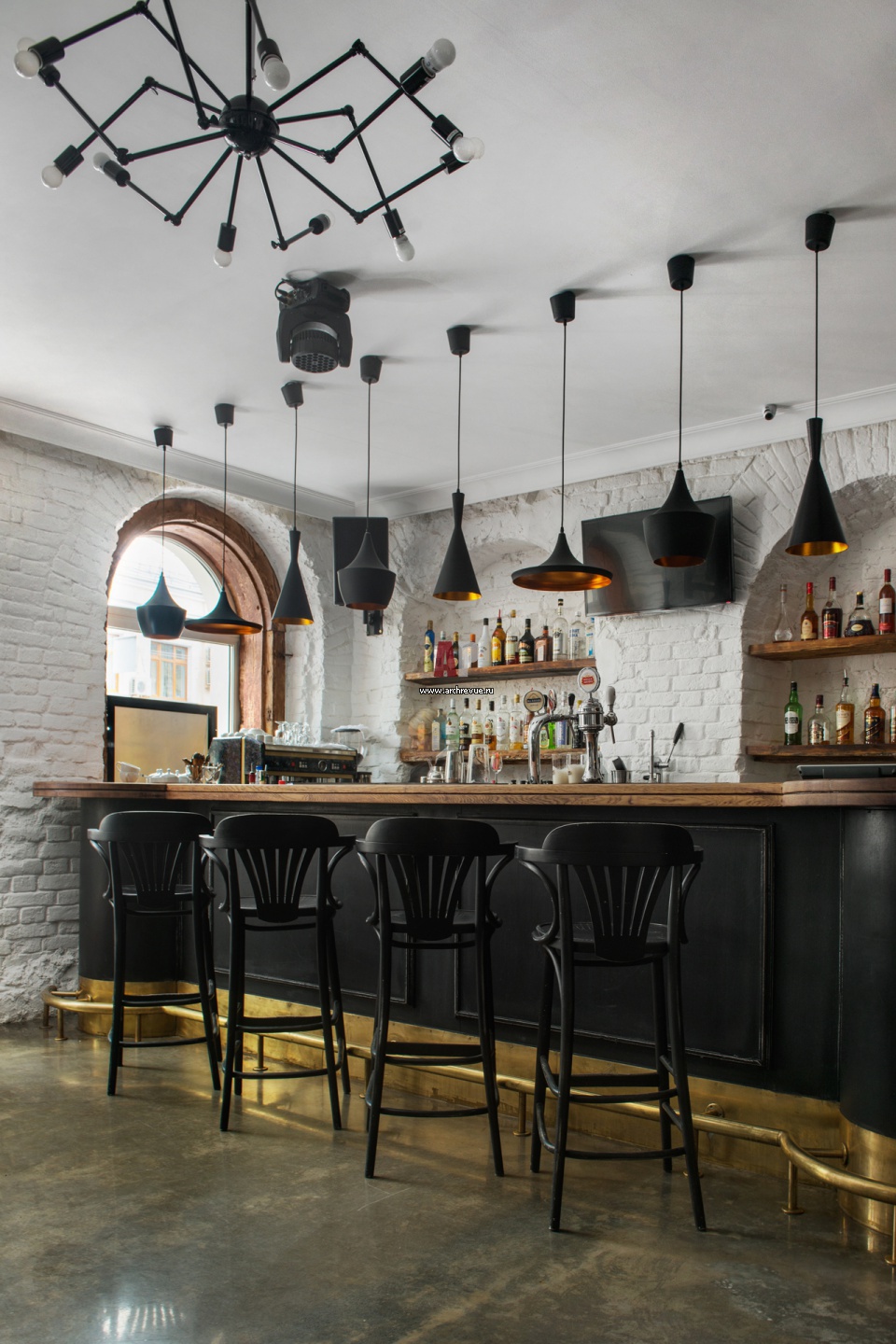 Интерьер бара. Низ барной стойки отделан металлической накладкой с бронзовым напылением и перекладиной для ног.