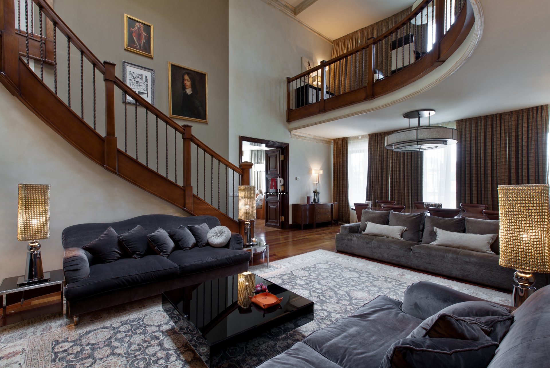 Лестничный холл и изогнутый балкон второго этажа – часть интерьера двусветной гостиной. Диваны, Ipe Cavalli, Fendi. Настольные лампы, Ipe Cavalli.