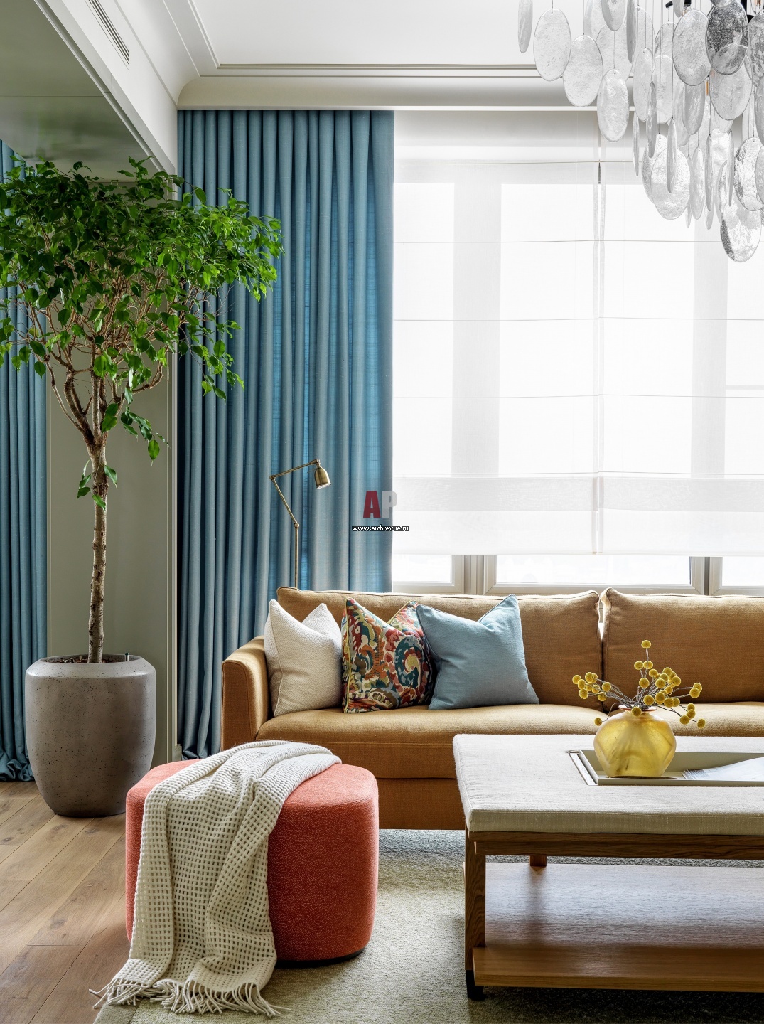 Спокойная квартира с яркими цветовыми акцентами и природной темой. Текстиль, Jim Thompson, Pierre Frey и Robert Allen.