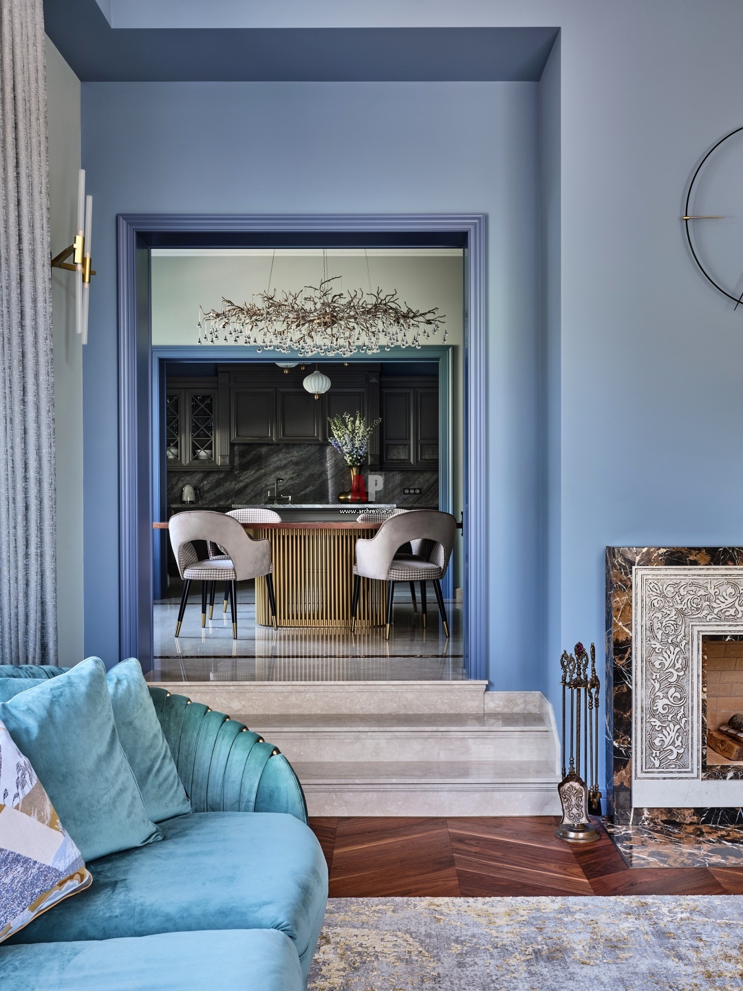 Кухня-столовая отделена от гостиной ступенями. Обрамление открытого портала выкрашено в контрастный лазурный оттенок. Ступени облицованы натуральным камнем.