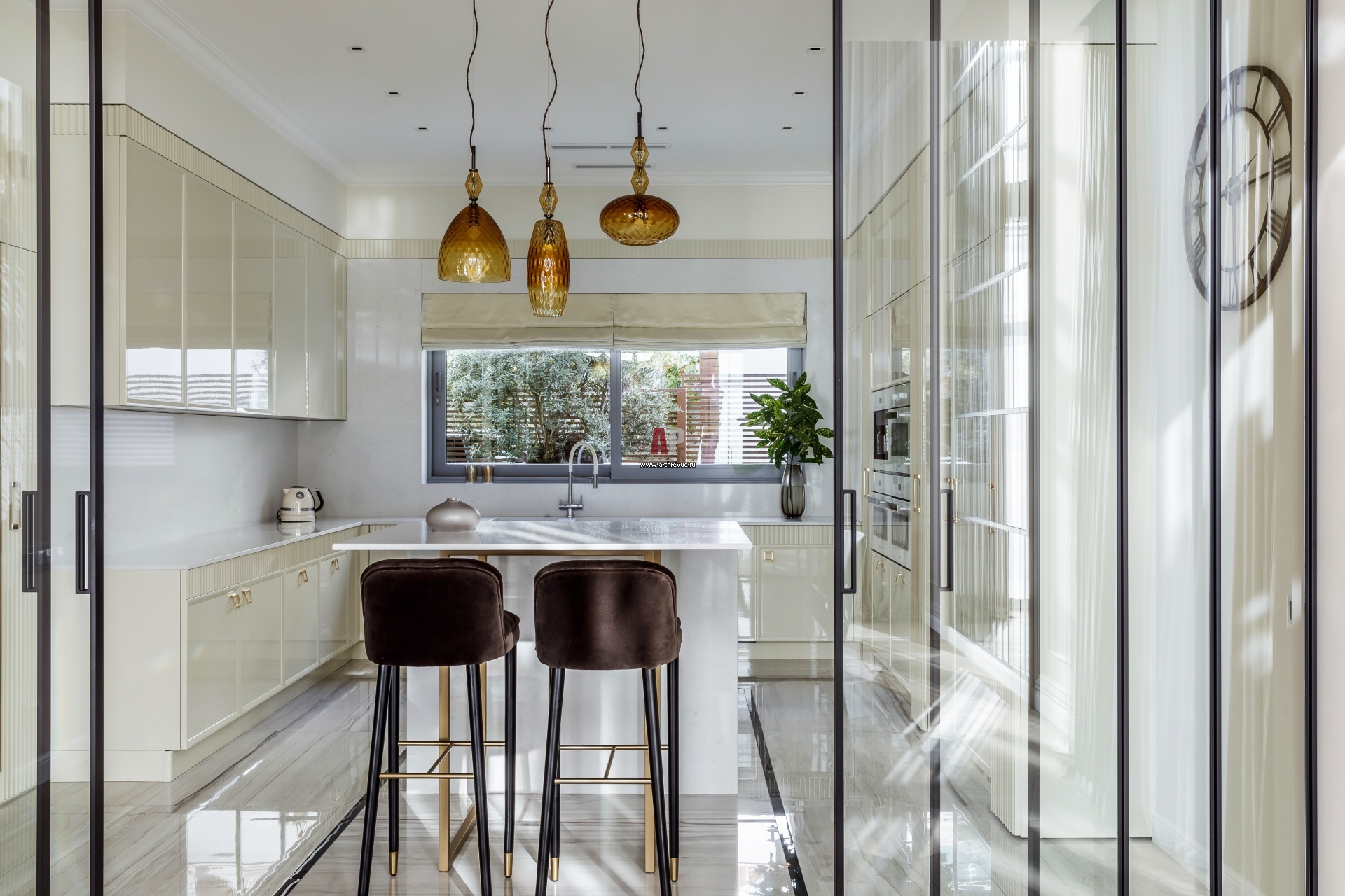 Кухонная зона выполнена сдержанно и лаконично, так как нужно было разместить много шкафов на небольшом пространстве и избежать ощущения тесноты и громоздкости. Тонкие черные полоски керамогранита очерчивают территорию острова. Эту изящную графику поддерживают черные профили перегородок.