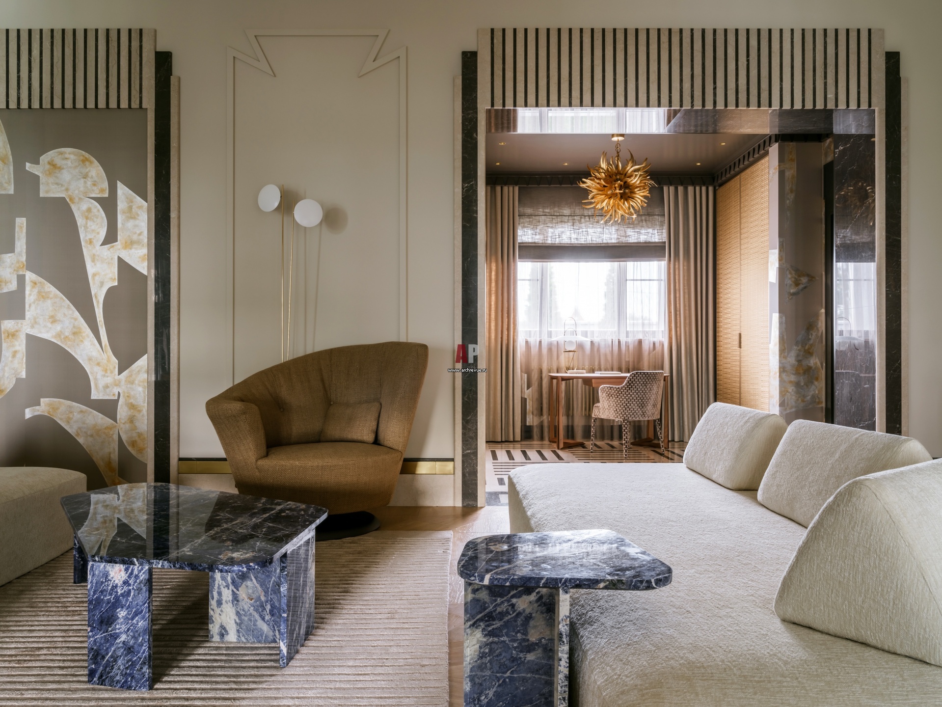 Гостиная с выходом в мини-кабинет. Слева на стене – обои De Gournay, такие же, как в прихожей. Кресло, Giorgetti.