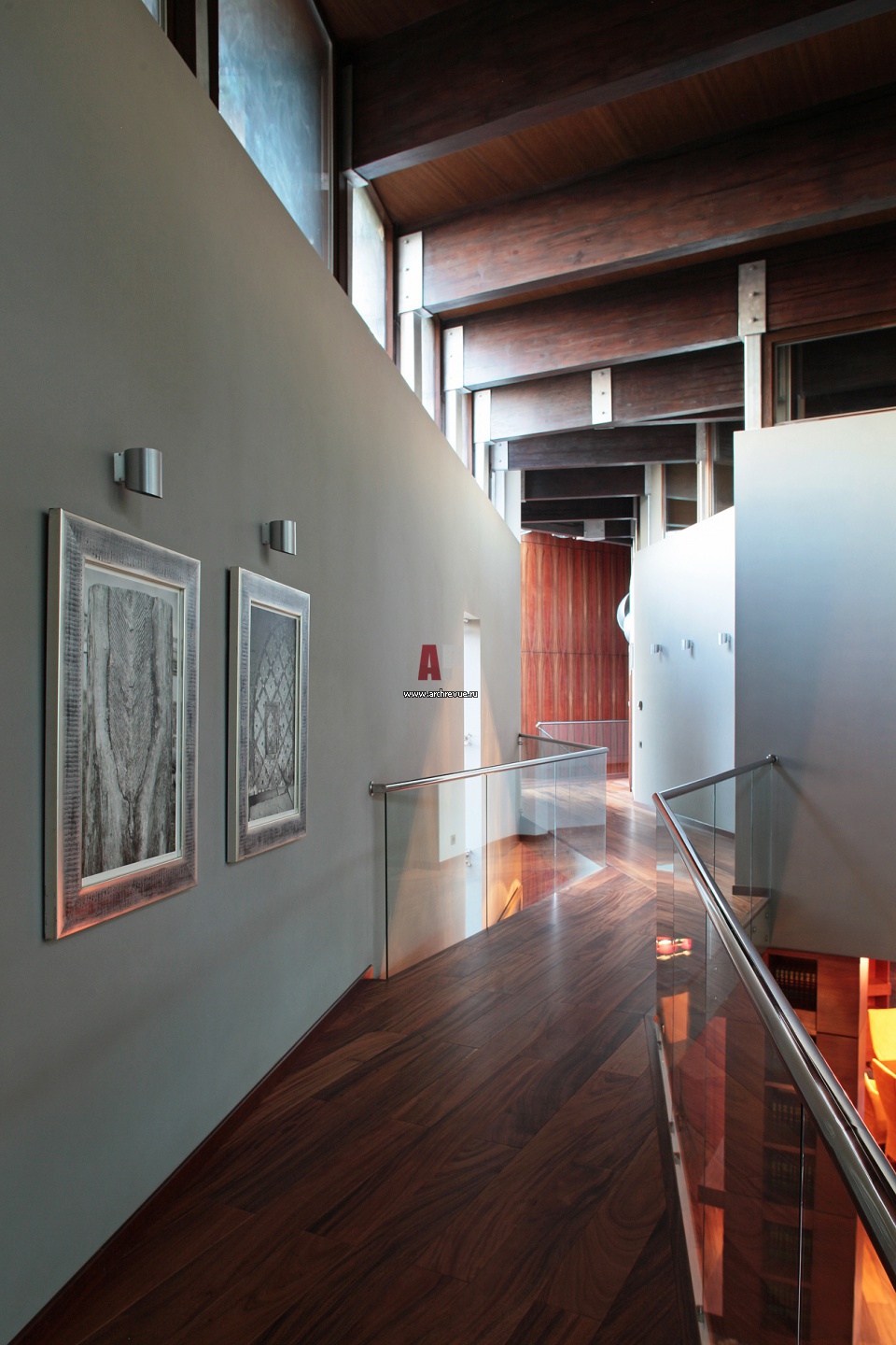 Коридор-галерея на втором этаже. Стены выкрашены в сложный серый цвет. Серый цвет является лучшим фоном для живописных работ и произведений искусства.