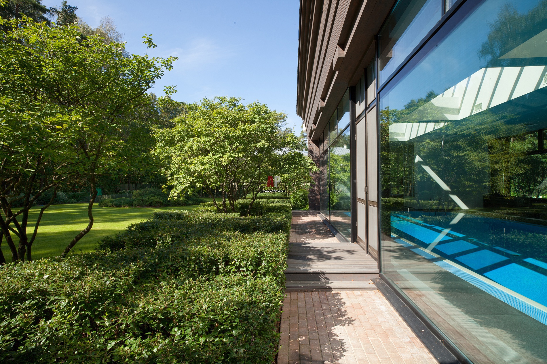 Выступающая часть дома - крытый бассейн со стеклянными стенами, оформлен по бокам геометрическим орнаментом из кубически стриженного массива кизильника и высаженными в шахматном порядке иргами в форме зонтов.