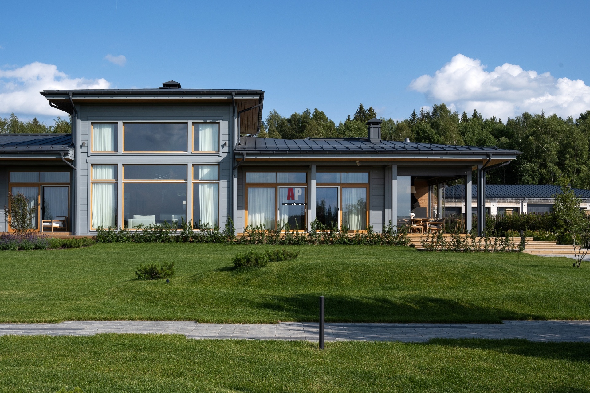 Одноэтажный дом из клееного бруса построен по индивидуальному проекту. Центральный элемент – двухсветная гостиная с роскошными панорамными окнами.