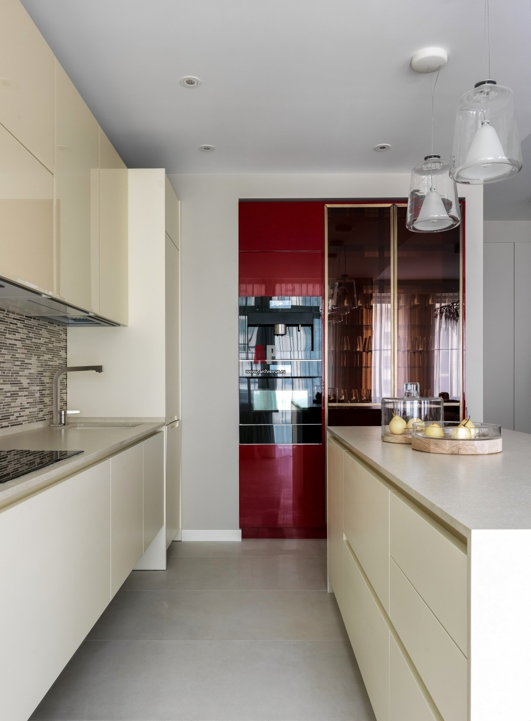 Интерьер кухни с красной глянцевой мебелью. Стеклянные цветные дверцы витрины для бокалов сделаны на заказ и обрамлены латунным профилем. Светильники над островом, Oluce.