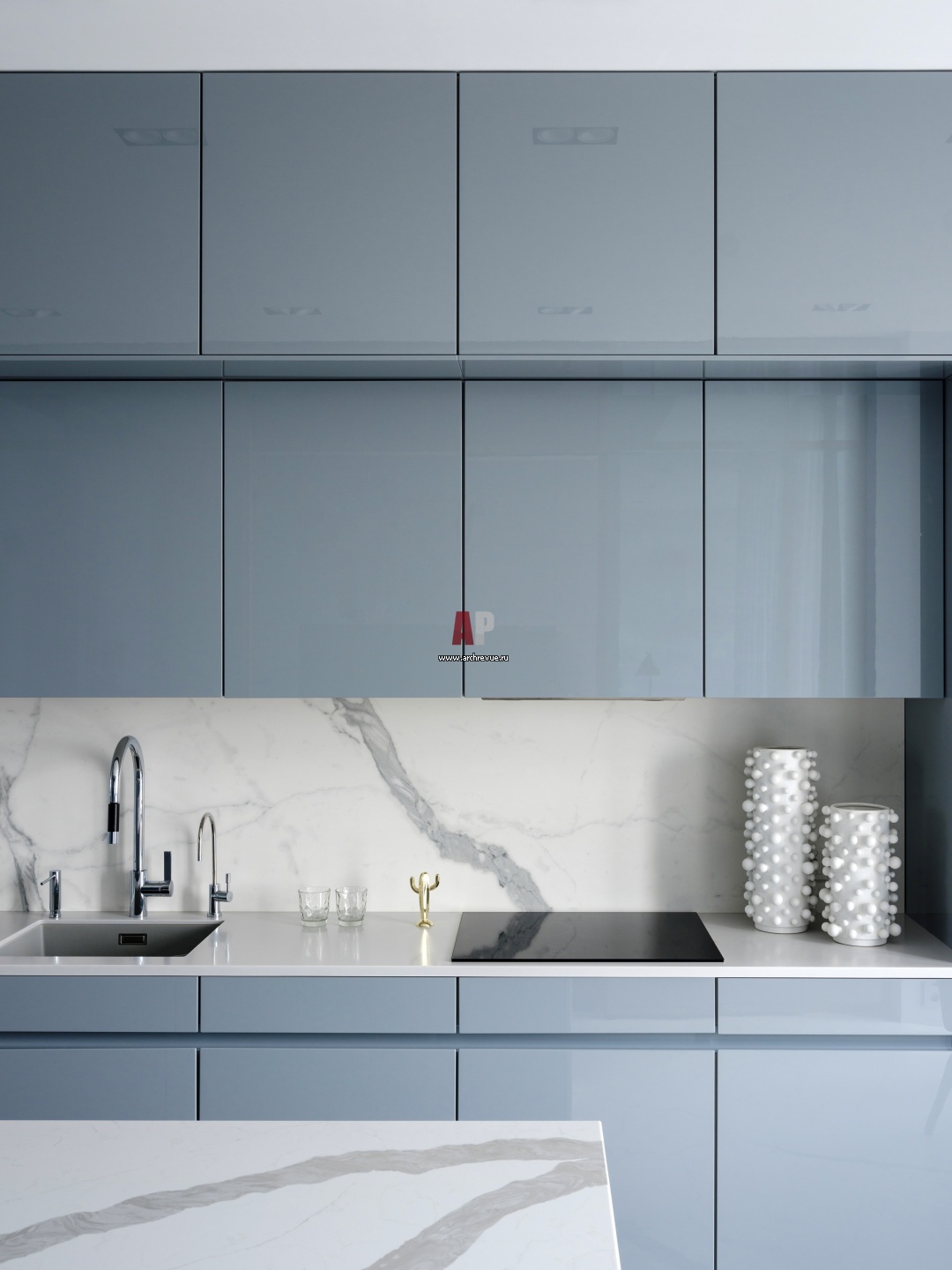 Эргономичная квартира для молодой семьи. Интерьер кухни в прохладных серо-голубых тонах.